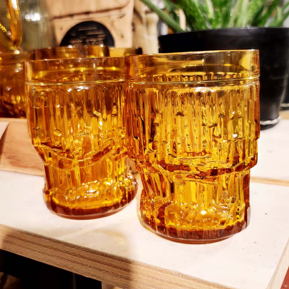 Dit Italiaanse glas uit de jaren 60 en 70 van het merk ‘Rocco Bormioli’ is gemaakt van gehard parmaglas met een specifieke kleur genaamd amberglas wat amberkleurig is en een warme, gele tint heeft. Met zijn opvallende reliëfpatroon heeft het glas een unieke, tijdloze uitstraling.